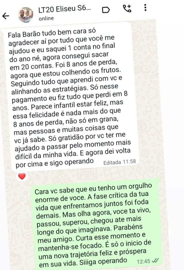 Já treinei mais de 2k traders com meu método, que faz exatamente o que nenhum curso técnico faz: blindo a mente pra ganhar 10x mais arriscando muito menos.